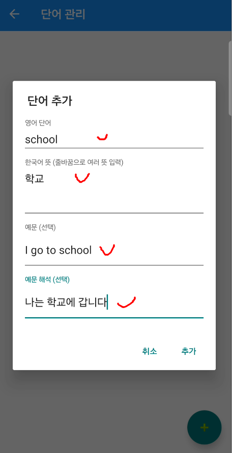 그리도 새로 만든 단어장으로 들어가서 단어 추가 / 수정 버튼을 누르면 새로운 단어를 추가할 수 있습니다.
