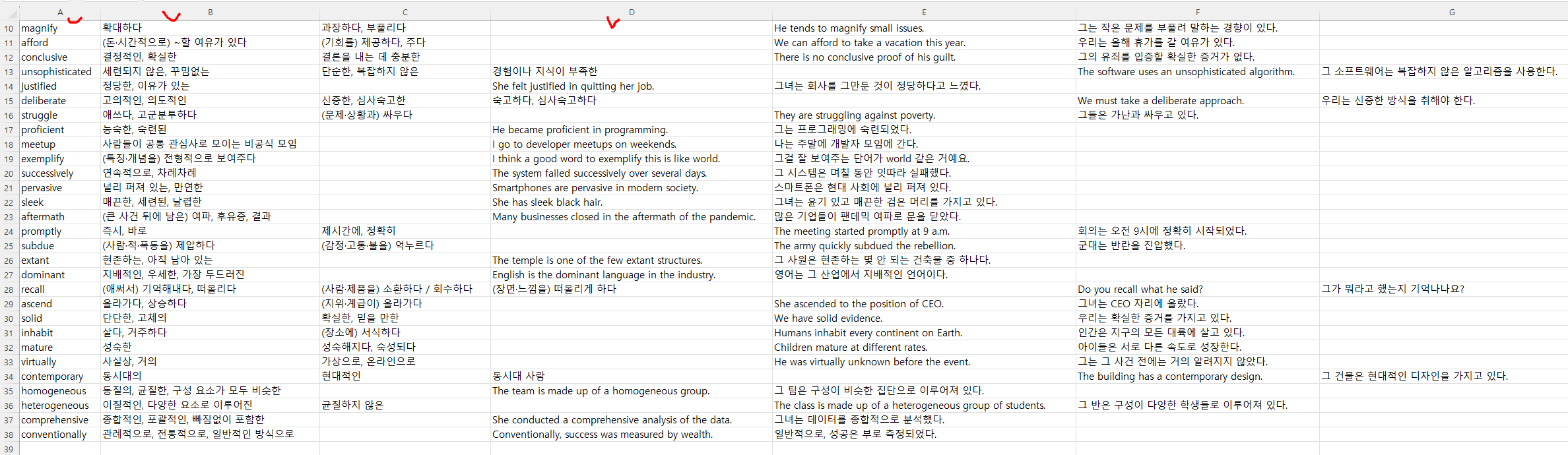 왼쪽부터 제일 첫번째 열은 단어, 두번째 열부터는 한국어 뜻을 작성합니다. 세번째 네번째 열 이어서 계속 작성이 가능합니다.