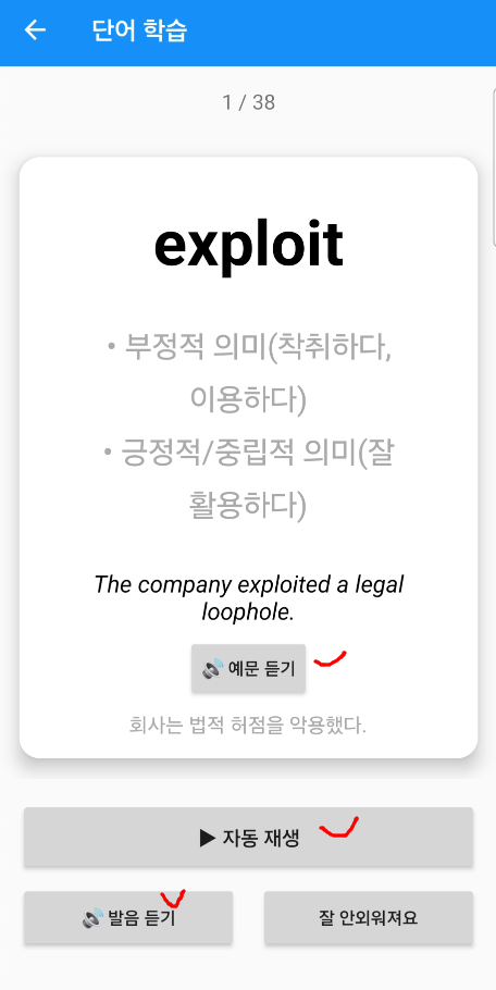 그리고자동 재생 버튼을 누르면 단어장의 단어들을 순회해 가면서 단어/한글뜻/예문/예문해석을 번갈아가면서 사운드로 출력해 줍니다.