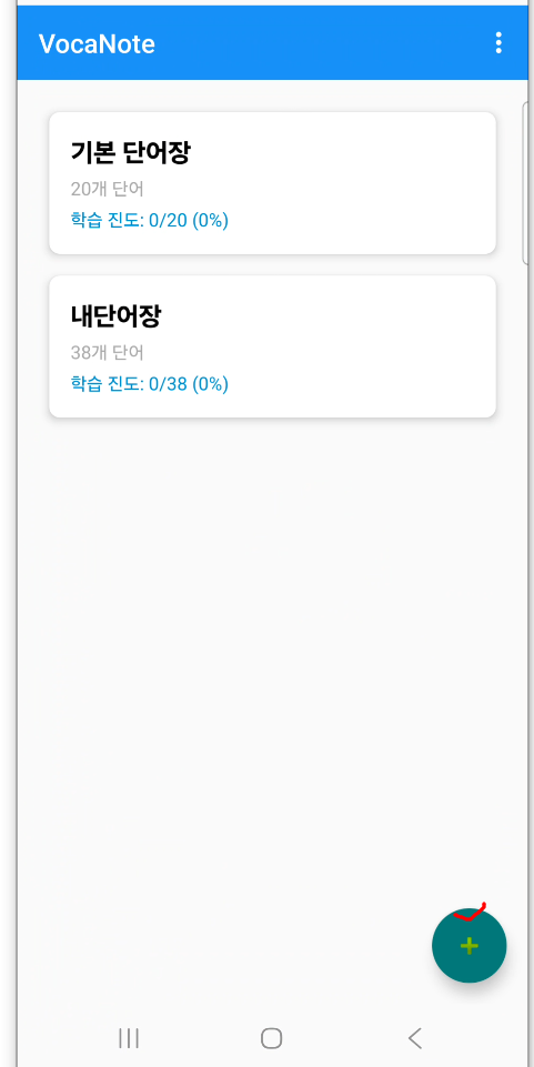 처음 앱을 설치만 기본 단어장 만 있는데 자신이 공부하고 싶은 단어장을 추가해서 만들 수 있습니다. 우측 하단의 + 버튼을 누르면 새 단어장을 만들 수 있습니다.